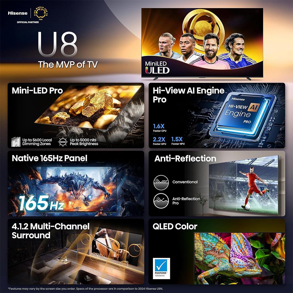 The Hisense U8 Series is an award-winning TV that makes for the ultimate game-watching experience. It’s enhanced with Mini-LED Pro technology, reaching up to 5,000 nits peak brightness for even sharper contrasts, brighter lighting and more dramatic shadows. Soak up over a billion vibrant shades on your screen with QLED Color. The 165Hz Native Refresh Rate and Anti-Glare Low Reflection Pro panel technology helps you see it all clearly without any interference. And Dolby Atmos along with an up to 82W 4.1.2 Multi-Channel Audio System bring all the sounds of the cinema right to your living room.