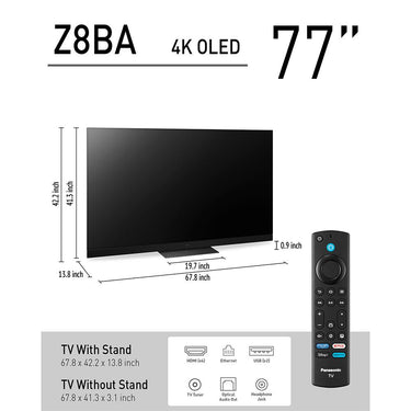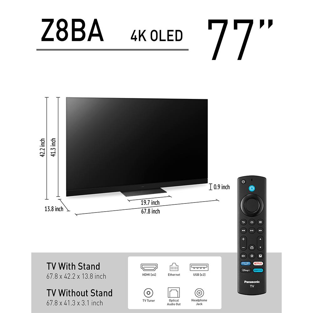 - Panasonic Z8BAP 77 Inch OLED 4K Smart, Fire TV, 144Hz HDR10+, One Box Cinema