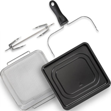 · Accessories Included: Drip Tray and Cage Tong, Mesh Tray, Wire Rack and Rotisserie Fork