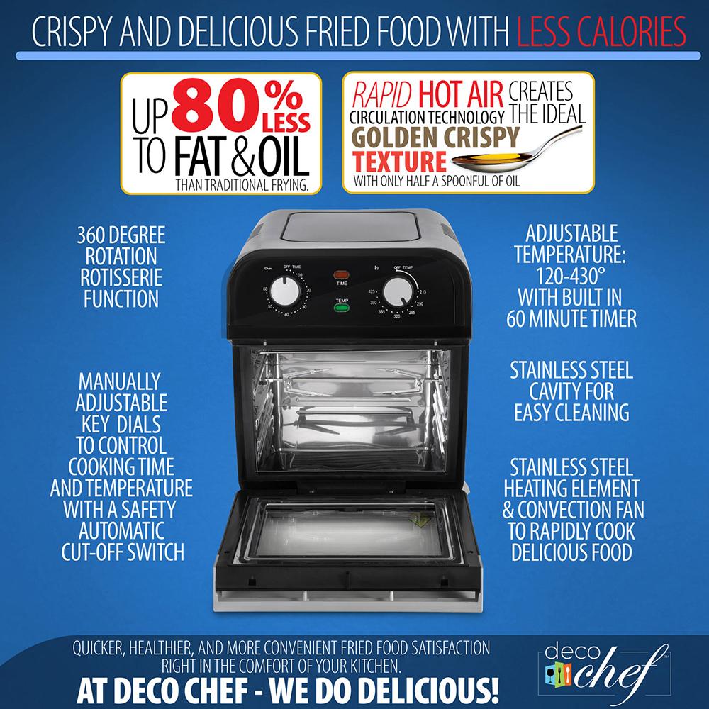 Restaurant quality taste with up to 70% less of the calories! At Deco Chef - We Do Delicious and with our 12.7 QT Multi-Function Oven Air Fryer you can too! Don't settle for microwaving your food and don't wait for your oven to preheat in addition to cooking time - make wonderful, healthy meals all with the turn of a dial. Using the power of circulating super-heated air, this fryer oven cooks your food evenly from all angles without the need of oil.