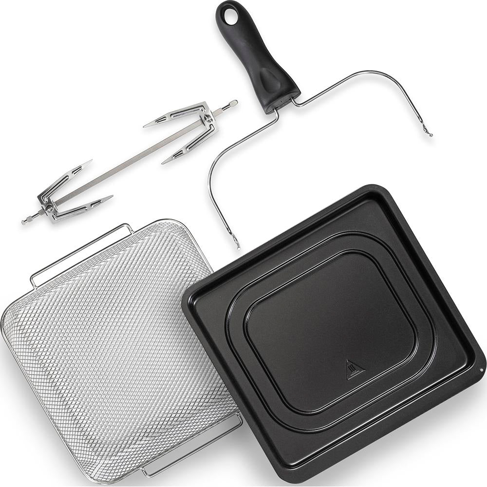 Accessories Included: Drip Tray and Cage Tong, Mesh Tray, Wire Rack and Rotisserie Fork
