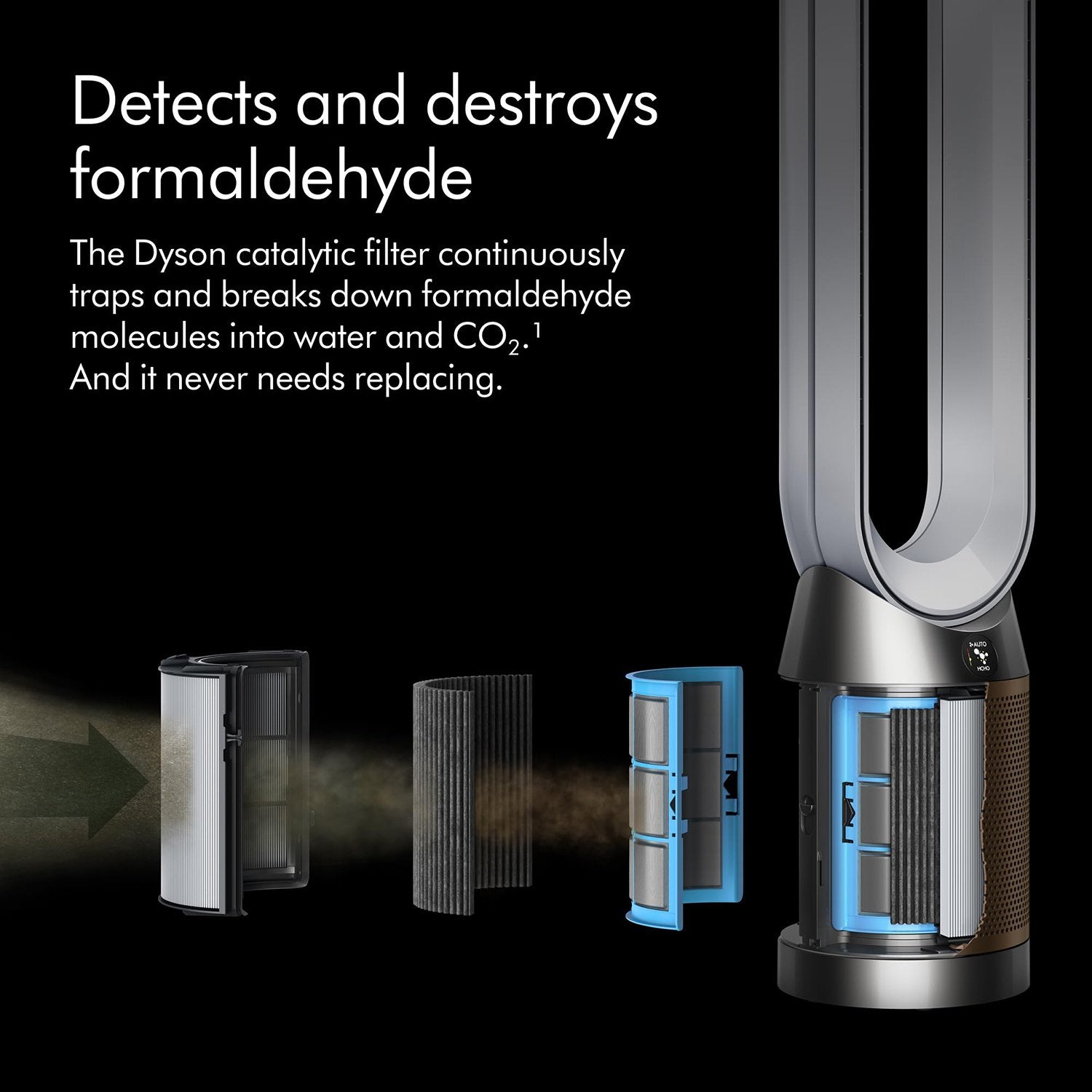 It combines a precise, solid-state formaldehyde sensor with a unique catalytic filter that continuously destroys formaldehyde. HEPA H13 and activated carbon filters also capture dust, allergens, gases and other ultrafine pollutants. And Dyson purifiers have powerful Air Multiplier™ technology to purify the whole room.