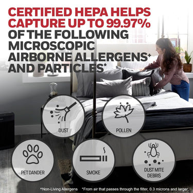 HEPA Filtration: this home air purifier helps capture up to 99.97% of the following microscopic airborne allergens and particles: dust, pollen, pet dander, dust mite debris and smoke.1