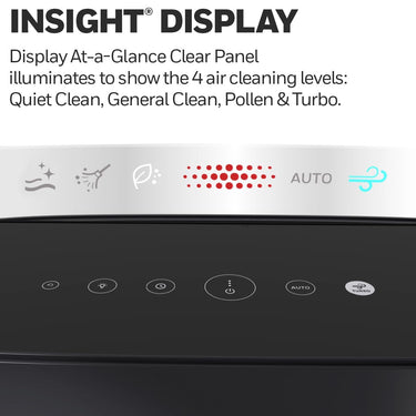 The Honeywell InSight™ Series Air Purifier delivers powerful HEPA filtration and features a cutting-edge design that displays device setting information from a distance. The Air Quality Indicator is powered by a VOC sensor that will constantly monitor room air quality while providing real time, easy to understand color coded feedback via the clear Insight™ Display Panel. When on Automatic Cleaning mode, the home air purifier uses the air quality reading to automatically adjust to the optimal cleaning level for cleaner air. The easy to read color coded feedback on the clear Insight™ Display Panel will illuminate which cleaning level (4 available) you've selected. The Honeywell InSight™ HPA5200 HEPA Air Purifier uses Certified HEPA filters to help capture up to 99.97% of microscopic allergens and particles.1 This portable air purifier can help capture airborne particles such as dust, smoke, pollen, pet dander and mold spores in large rooms (4.8 x air changes per hour in a 360 sq. ft.).2 This makes it an excellent choice to use as an air purifier for allergies or as a pet air purifier. In addition, the carbon activated pre-filter helps trap larger particles and helps reduce odors and VOCs (volatile organic compounds).