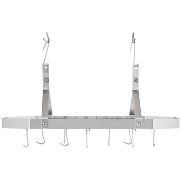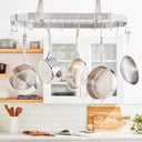 - Sturdy wall-mount pot rack introduces style and function to any kitchen