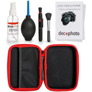 Deco Photo’s All in One Cleaning Kit is perfect for cleaning your DSLR camera as well as Telescopes, Spotting Scopes, Eyeglasses, View Finders and more. Inside the stylish carrying case you'll find Lens/Sensor cleaning solution, a book of lens tissue paper, a dual sided pen with a brush and carbon cap, large bristel brush and an air blower to blow away hard to reach dust and build-up.