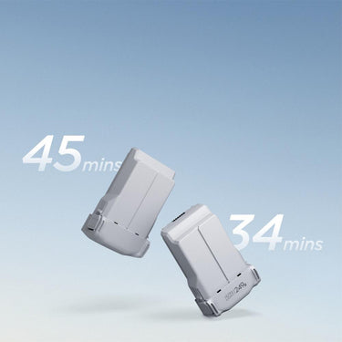| Max Flight Time | 34 minutes (with Intelligent Flight Battery) 45 minutes (with Intelligent Flight Battery Plus)* Measured in a controlled test environment. Specific test conditions are as follows: flying forward at a constant speed of 21.6 kph in a windless laboratory environment at 20 meters above sea level, in photo mode (without photo taking operation during flight), with Obstacle Avoidance Action set to Off, and from 100% battery level until 0%. Results may vary depending on the environment, actual use, and firmware version. * The Intelligent Flight Battery Plus is not sold in Europe. |