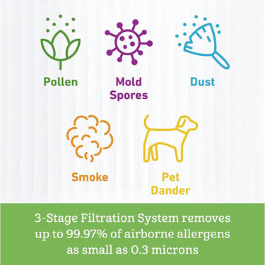 3-Stage Filtration System removes up to 99.97% of airborne pollutants and allergens, capturing particles as small as 0.3 microns