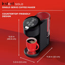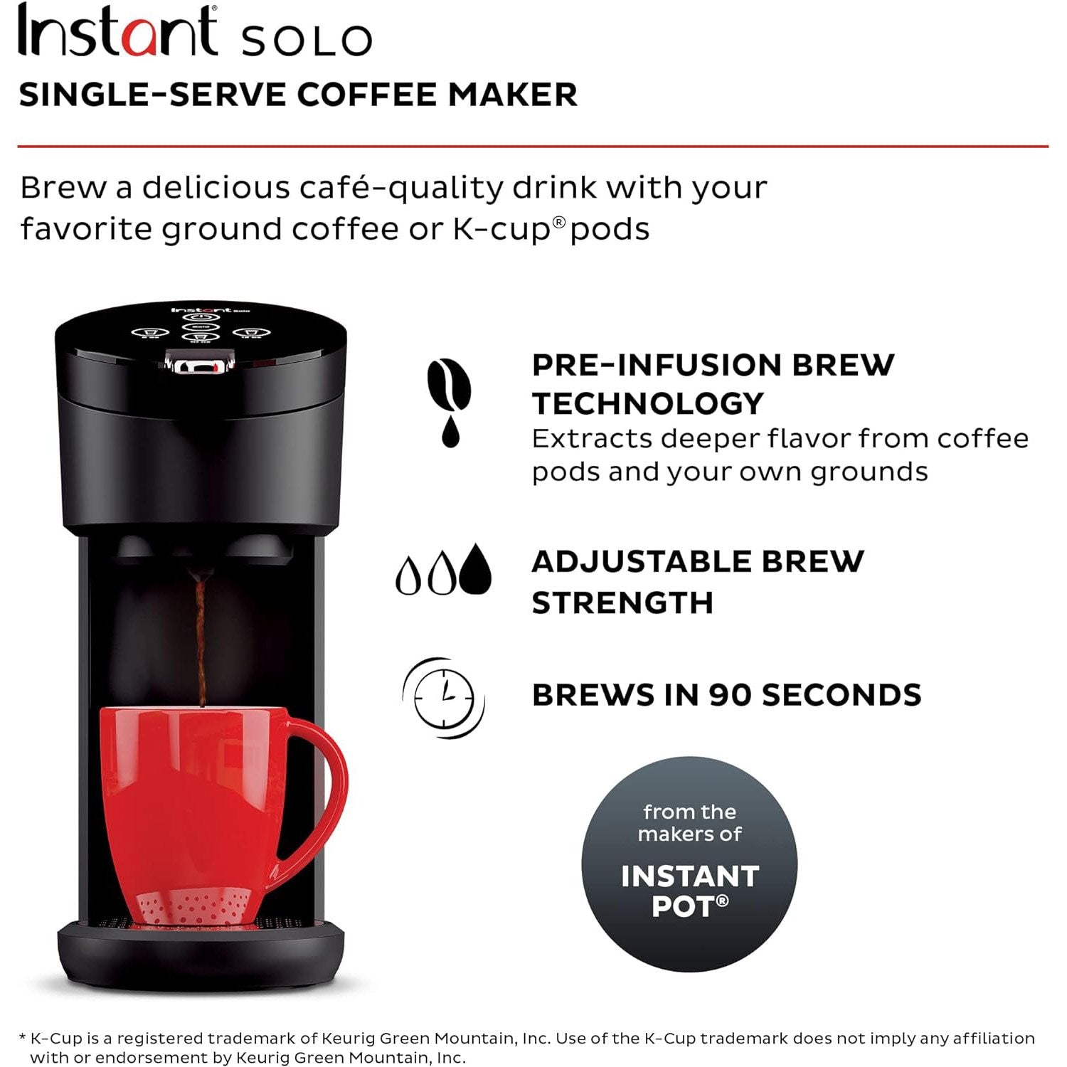 Brewing a great cup of coffee at home is easy with the Solo Single-Serve 2-in-1 Coffee Maker. It can handle both K-Cup® pods and your own grounds in the included reusable pod with handle. When placed in the Instant Solo, the reusable pod activates a unique brewing sequence that extracts more flavor, aroma and body from your favorite ground coffee. Choose from multiple brew sizes with 8, 10 or 12 oz cups, and adjust the brewing strength to make it as bold as you like. The 40oz reservoir means you can refill less frequently, and the removable drip tray lets you fill up to a 7" tall 16oz travel mug.
