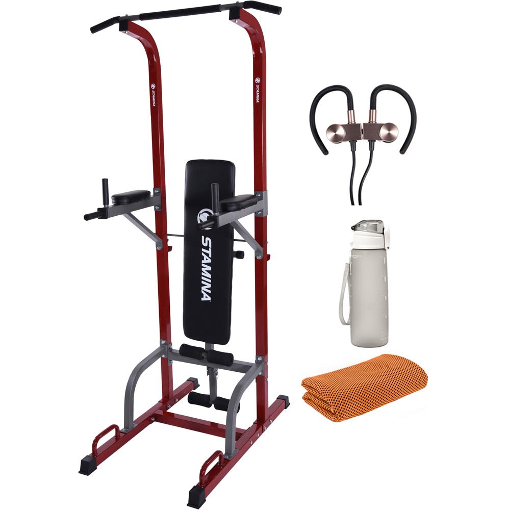 Stamina Full Body Power Tower with Upholstered Bench with Earbuds Bundle