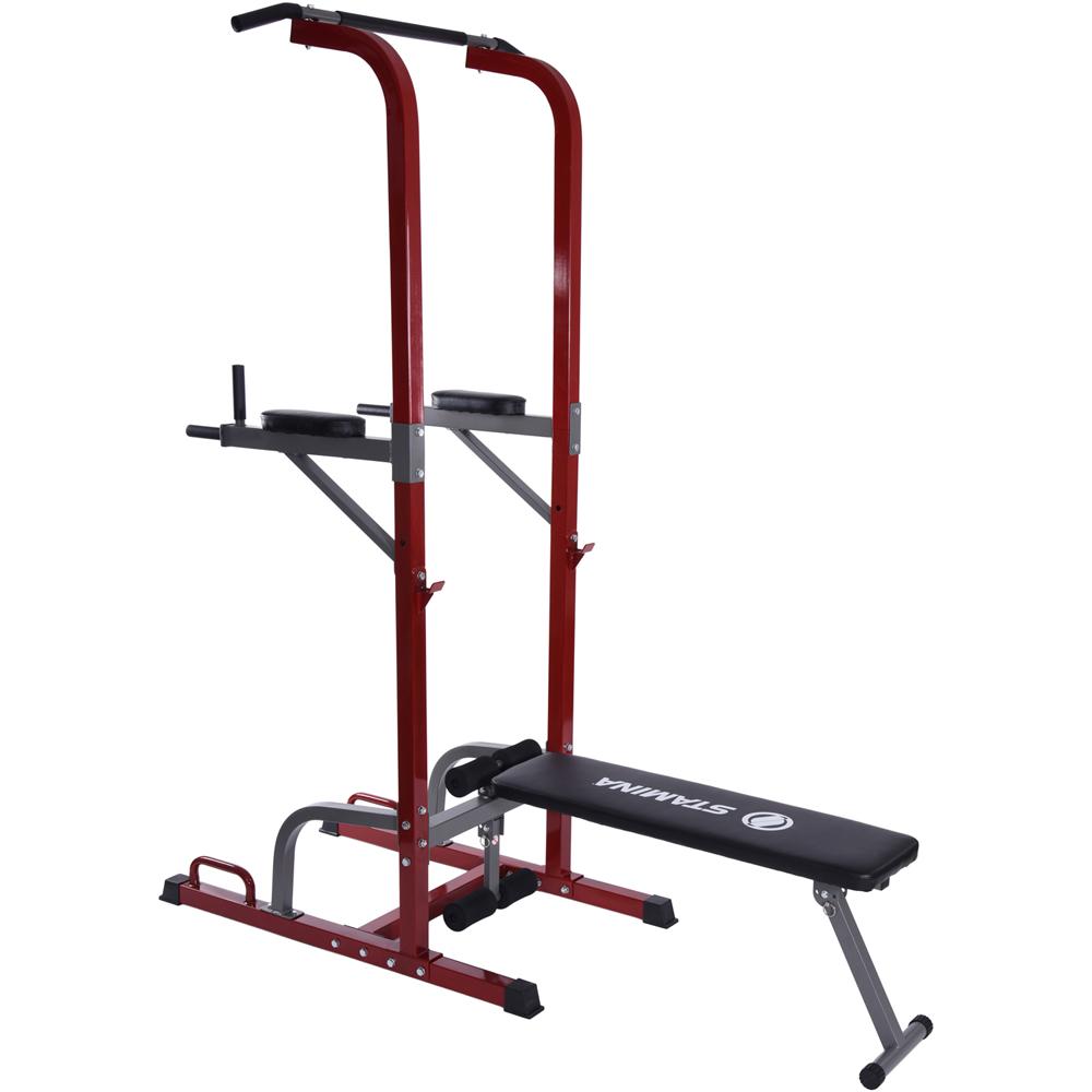 Stamina Full Body Power Tower with Upholstered Bench and Weight Bar Rack