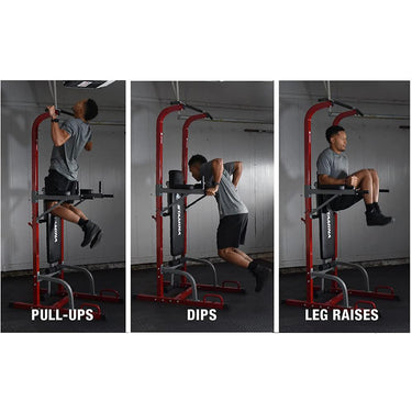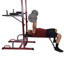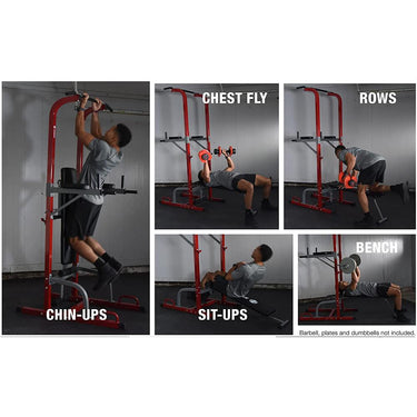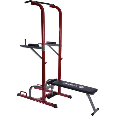 The solid steel frame and bold, red design make the Power Tower a centerpiece in any home gym. When you're done using the bench, fold it up onto the Tower to save space.