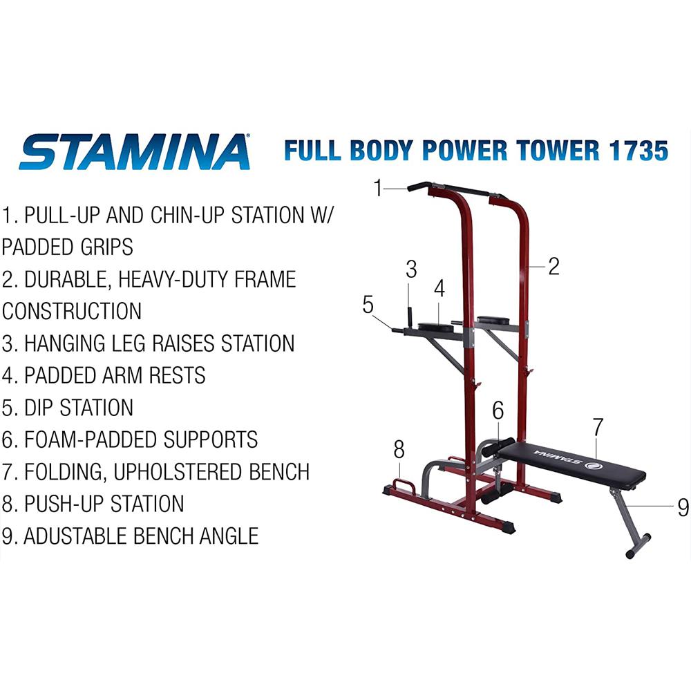 The Stamina Full Body Power Tower 735 provides a powerful bodyweight workout outlet on one piece of equipment. No matter what your fitness goal is, the Stamina Full Body Power Tower will help. Multiple exercise configurations make this an all-in-one home gym centerpiece.