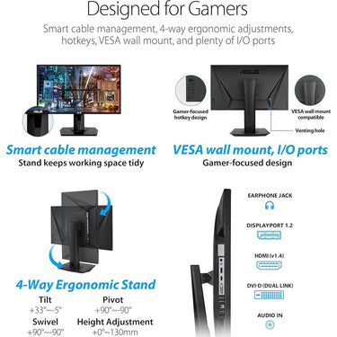 - ASUS VG248QG. Display diagonal: 61 cm (24"), Display resolution: 1920 x 1080 pixels, HD type: Full HD, Response time: 1 ms, Native aspect ratio: 16:9, Viewing angle, horizontal: 170°, Viewing angle, vertical: 160°. Built-in speaker(s). VESA mounting, Heig