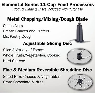 The Cuisinart Elemental 11 Cup Food Processor lets you quickly and easily prepare large portions of ingredients for meals with minimum effort. The generous 11 cup work bowl, make this food processor the ultimate timesaver for your favorite dishes, making quick work of everything from chopping nuts and pureeing soup to slicing tomatoes and shredding cheese. Another time saver - the rubberized touchpad with Pulse control is wipe-clean and the removable parts are dishwasher safe!