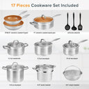 • Comprehensive 17-Piece Set: Includes 1.6 QT and 2.5 QT saucepans with lids, 4.2 QT casserole with lid, 8.6 QT stockpot with lid, 5.5 QT sauté pan with helper handle and lid, 8" and 9.5" fry pans, 9.5" boiler and steam baskets, plus a 2-prong fork, solid spoon, and slotted turner.