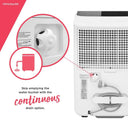 Features an easy-to-clean washable dust filter, customizable humidity control, continuous drain option, automatic shut-off, a hassle-free front loading bucket, portable design with caster wheels and side handles, and low temperature operation down to 41°F. It also features a convenient carry handle and splash guard for easy emptying.