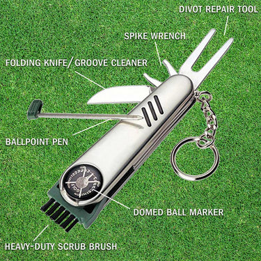 - Deco Essentials Stainless Steel 7-in-1 Multi-Function Golf Tool - Fix Divots, Clean Clubs, Play