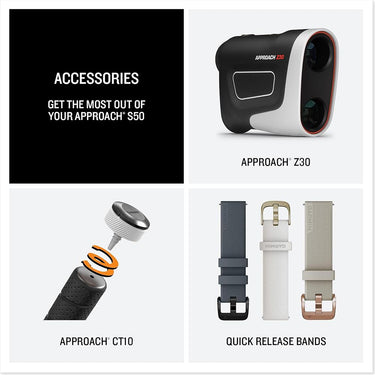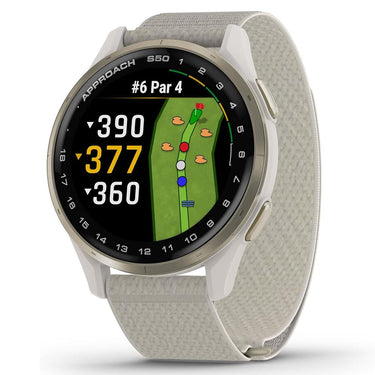 We’ve got your game with Approach S50, the GPS golf watch that gives you what you need on the course and beyond. Its slim, lightweight design and ComfortFit nylon strap make it an easy all-day wear. Its bright 1.2” AMOLED display makes it easy to see key yardages to the green, hazards and doglegs on 43,000+ preloaded courses worldwide. Get PlaysLike Distance of each shot with adjusted yardage for elevation changes, and even if you can’t see the green, always know where it is with PinPointer. Off the course, stay on top of your health with activity profiles for strength, yoga and running — plus heart rate and advanced sleep monitoring (data presented is intended to be a close estimation of metrics tracked). With up to 10 days of battery life in smartwatch mode and 15 hours in GPS mode, you can play another round without having to stop and charge. Get all the features you need on the course — and beyond — with the Approach S50 GPS golf smartwatch.