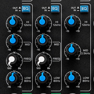 3-band Perkins EQ with On/Off hard bypass switch on all channels