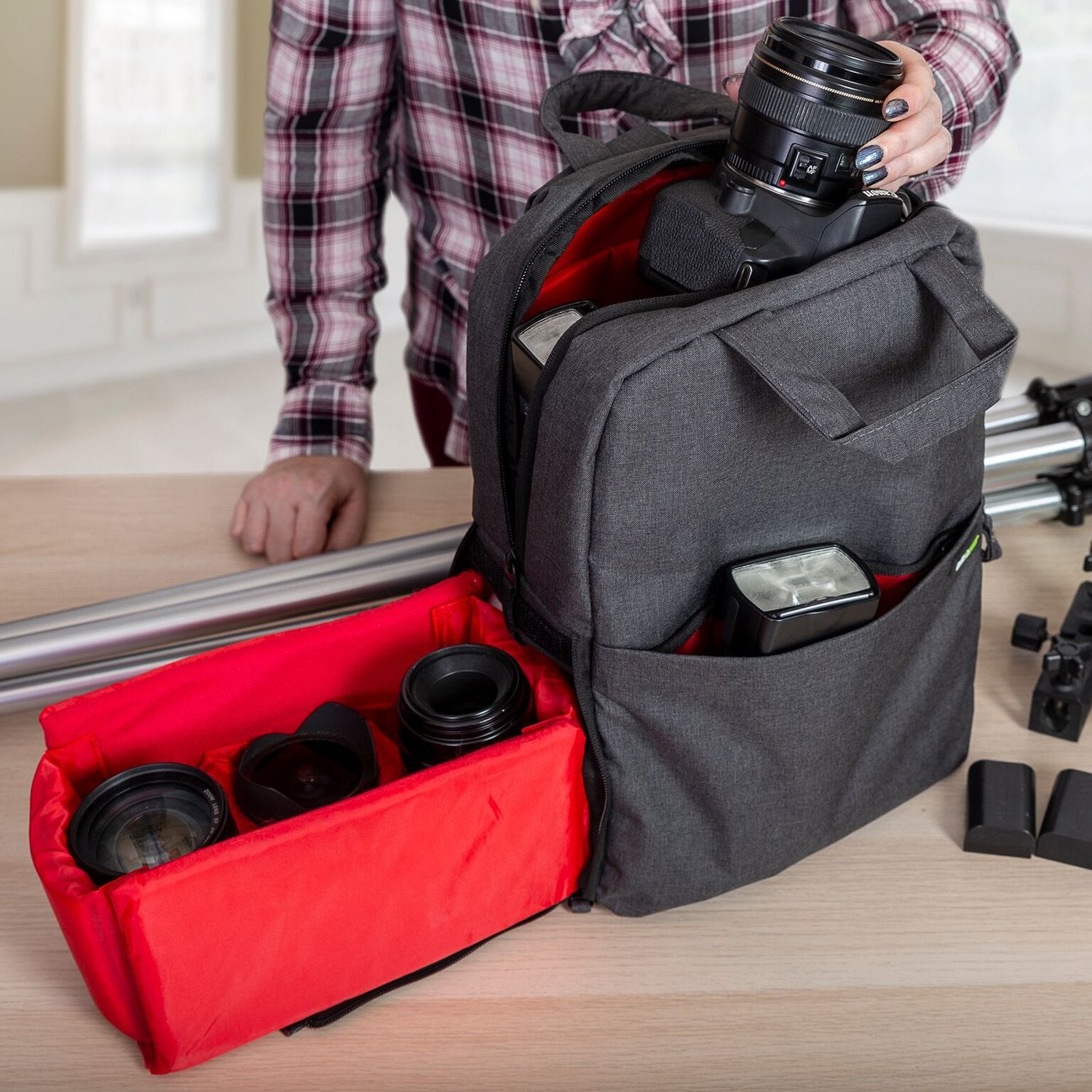 The large capacity design allows you to carry your camera, 2-3 lenses, tripod, accessories, and a 13" laptop - giving you the ability to take pictures and edit all on-the-go!