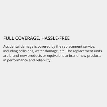 Accidental damage is coveredby the replacement service, including collsions,water damage, etc. The replacement unites are brand new products or equivalent to brand new products in performance and reliabilty.