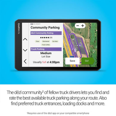 This dēzl navigator works with the Garmin eLog™ compliant ELD (sold separately) for subscription-free Hours of Service recording.