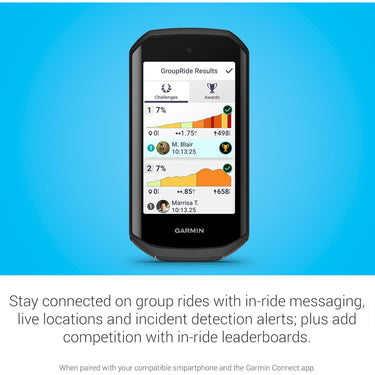Stay connected on group rides1 with in-ride messaging, live locations and incident detection alerts2; plus, add fun and competition with in-ride leaderboards for climbs and postride awards.