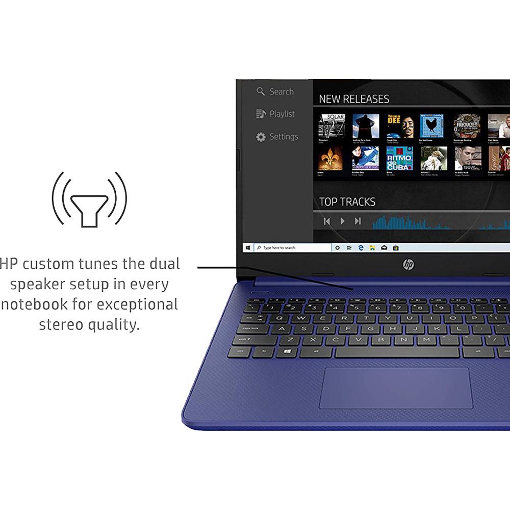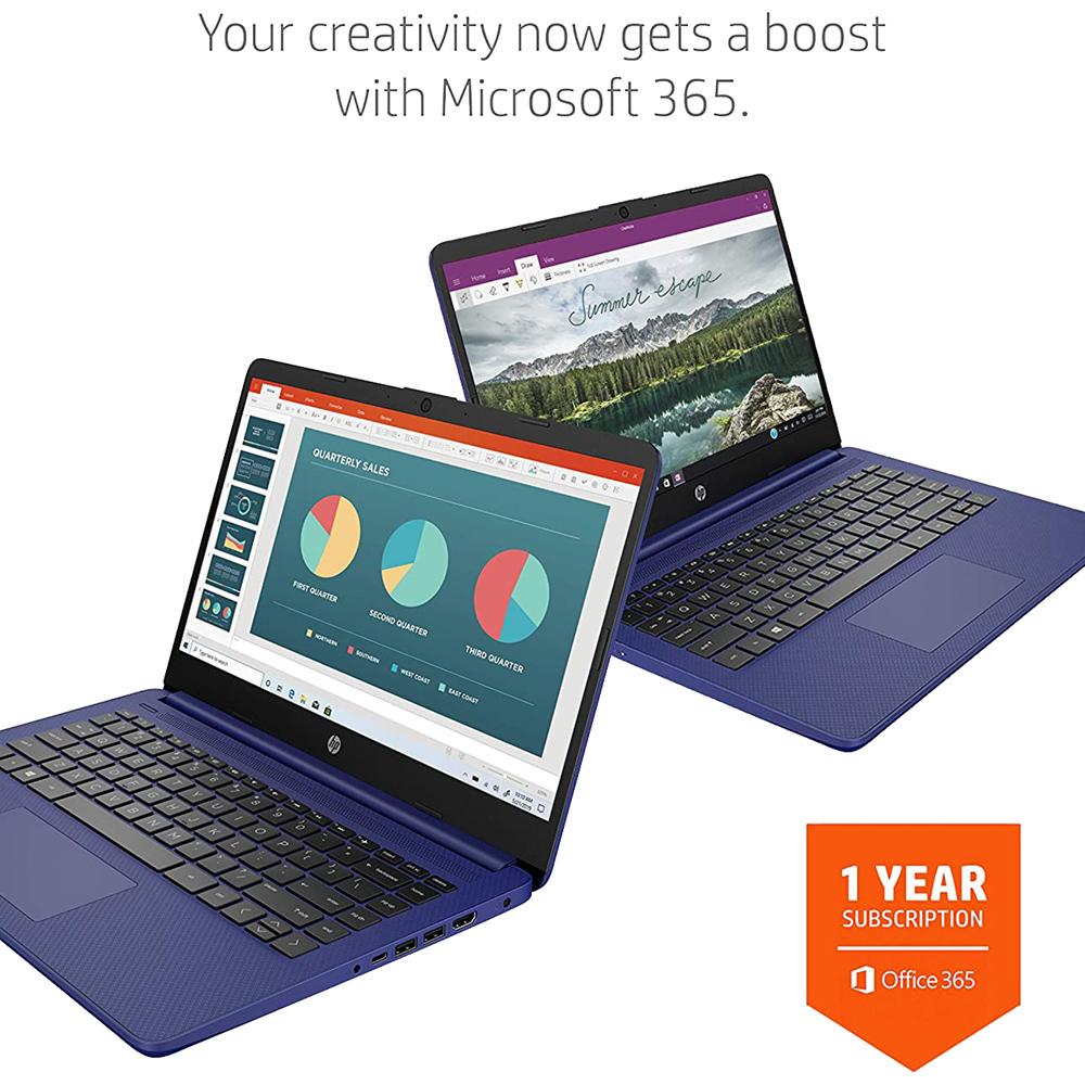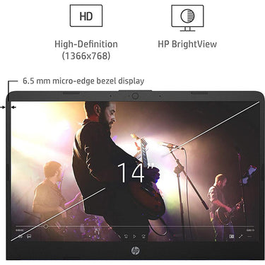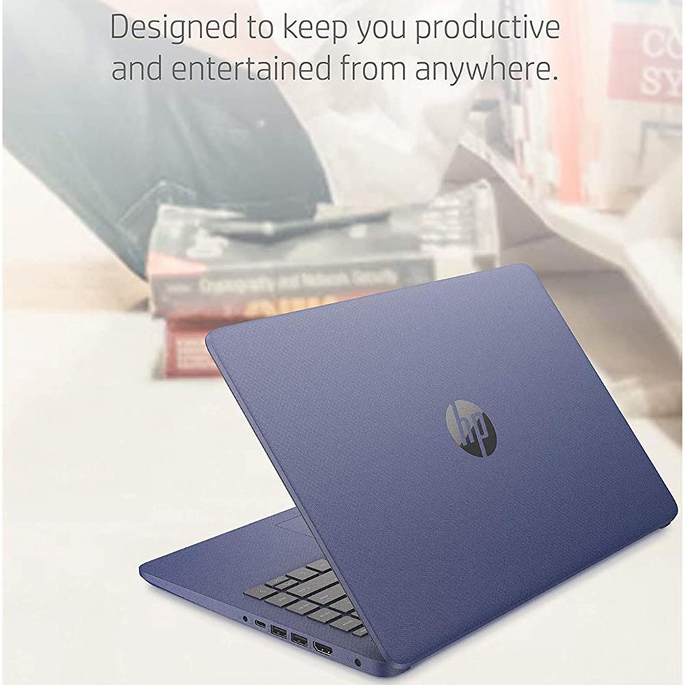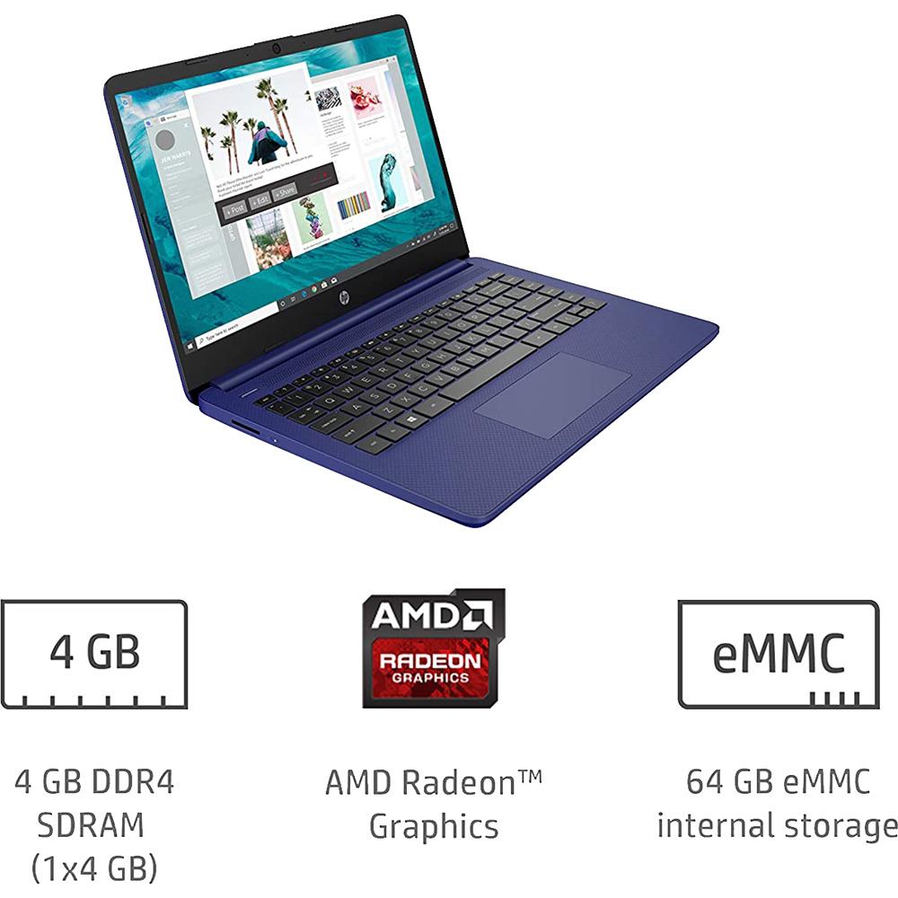 Stay productive and entertained from anywhere with the HP 14 Laptop.* This Windows 10 laptop is lightweight and has a long-lasting battery,** the ideal combo for working all day, and while on the go. Lean into the dependable performance of the latest AMD processor and Radeon™ Graphics card, even on your busiest days or long streaming sessions. See more of your entertainment on a 6.5 mm bezel, HD display while you store more of the content you love with 4 GB of RAM and 64 GB eMMC of storage.