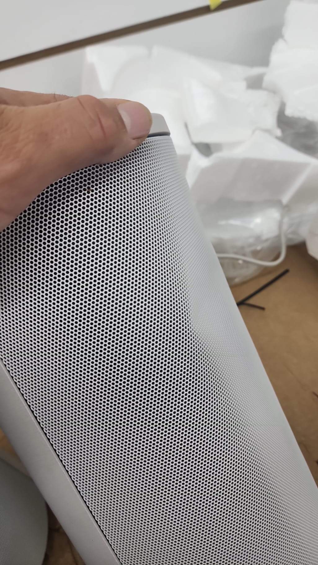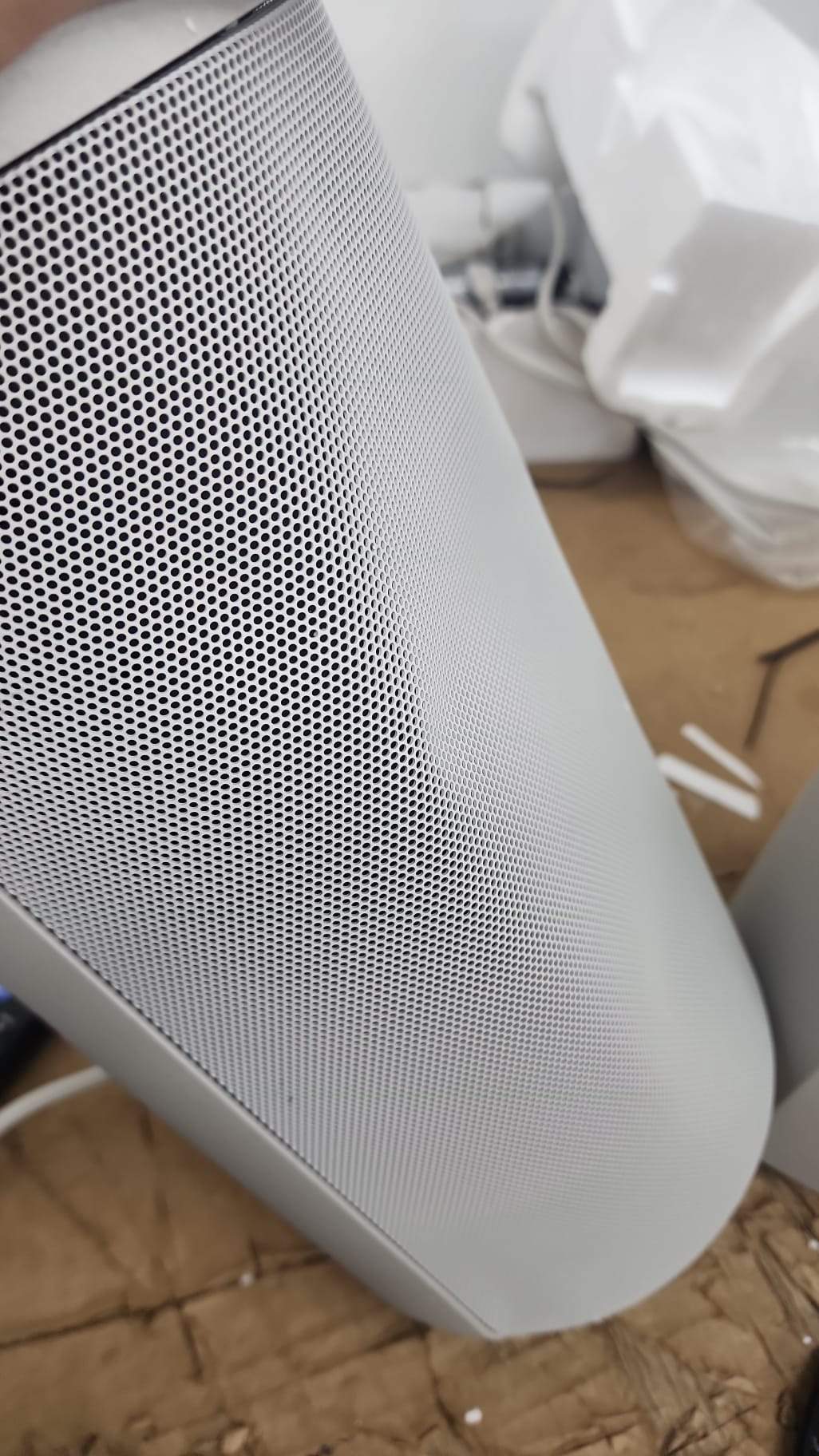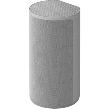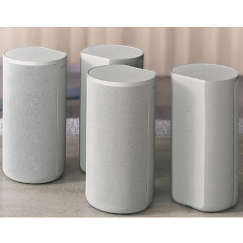 The HT-A9 is one of our latest home sound systems, designed using the Omnidirectional Block concept. The cylindrical shape represents a single solid block providing 360 spatial sound. It fits perfectly against the wall with a flat rear surface. The light pearl grey color blends well with walls, shelves and other interior elements.