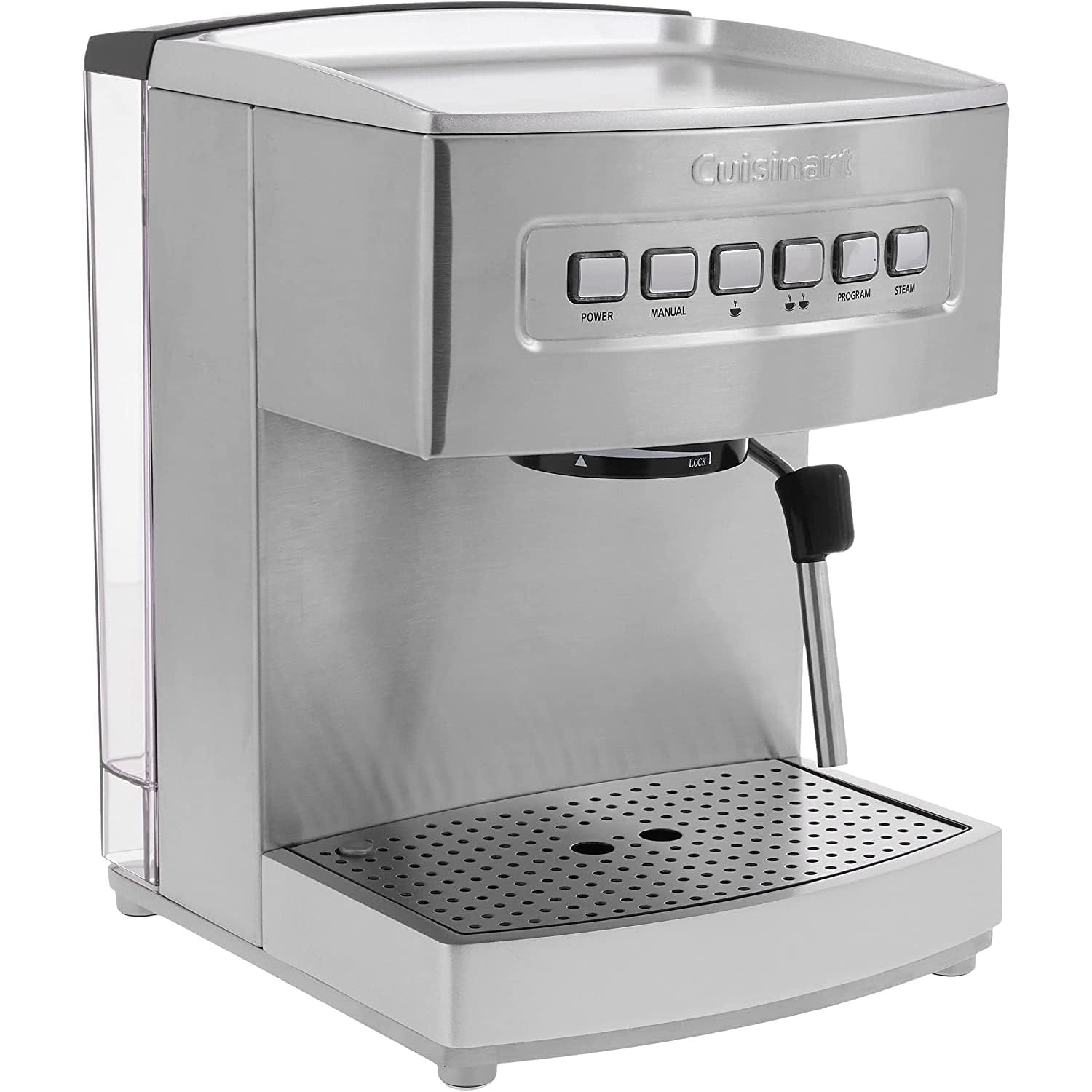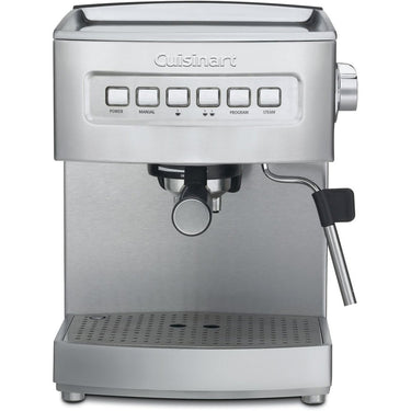 Want a single or double espresso? The choice is yours with the Cuisinart® Programmable Espresso Maker! Program a single or double espresso and savor the rich flavors that Cuisinart® brings out with 15 bars of pressure, or add hot water for an Americano, or add frothed milk for a creamy cappuccino or luscious latte. The stainless stem nozzle and frothing cup makes barista beverages easy. The Programmable Espresso Maker also features a cup-warming plate, removable drip tray, and cover for convenience.