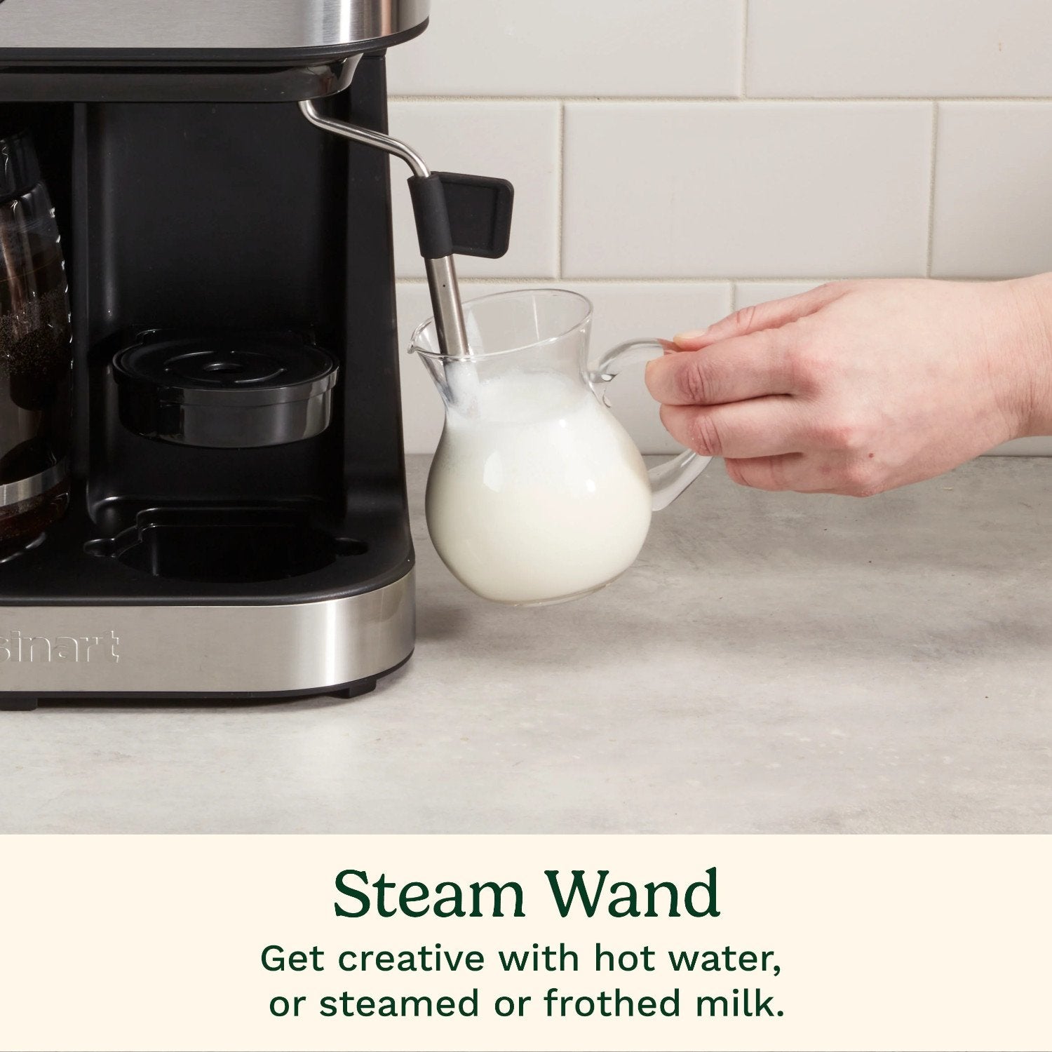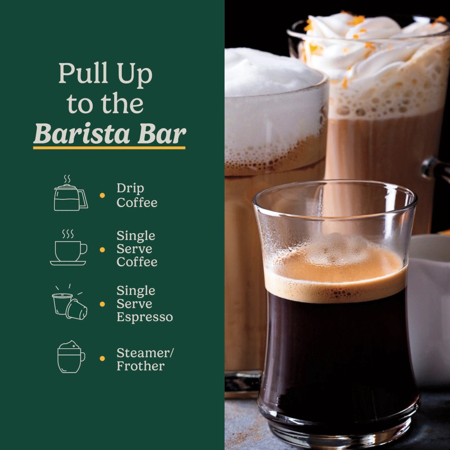 Bring the café home with the Cuisinart® Coffee Center® Barista Bar, and experience four brew options with compact convenience. Serve friends and family with 12 cups of fresh coffee brewed to perfection with programmable time, temperature, and strength settings. Or go solo with single-serve cups, in 6-, 8-, and 10-ounce sizes, made in minutes and compatible with most single-serve pods. For extra-bold flavor, pop in a Nespresso® OriginalLine-style capsule, and enjoy a single or double shot of espresso. Add variety to drinks with the steam wand that makes frothed and steamed milk for cappuccinos, lattes, or the specialty drink of your choice. The wand is also perfect for pouring hot water for tea, matcha, hot cereals, and soups. With sleek modern styling and total versatility, this space-saving all-in-one unit is sure to be the favorite spot in any kitchen.