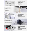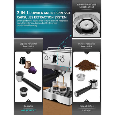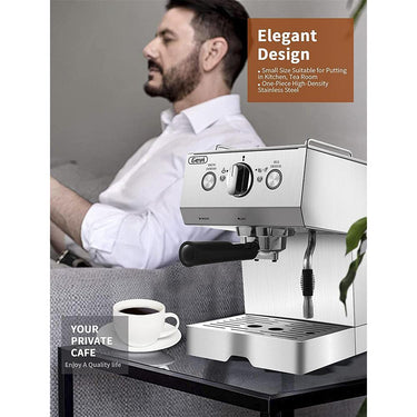 Espresso Machine, 15 bar professional Italian pump, with 1100W powerful pressure to extract coffee. NOTE: Turn off by yourself when reaching the desired amount of espresso.