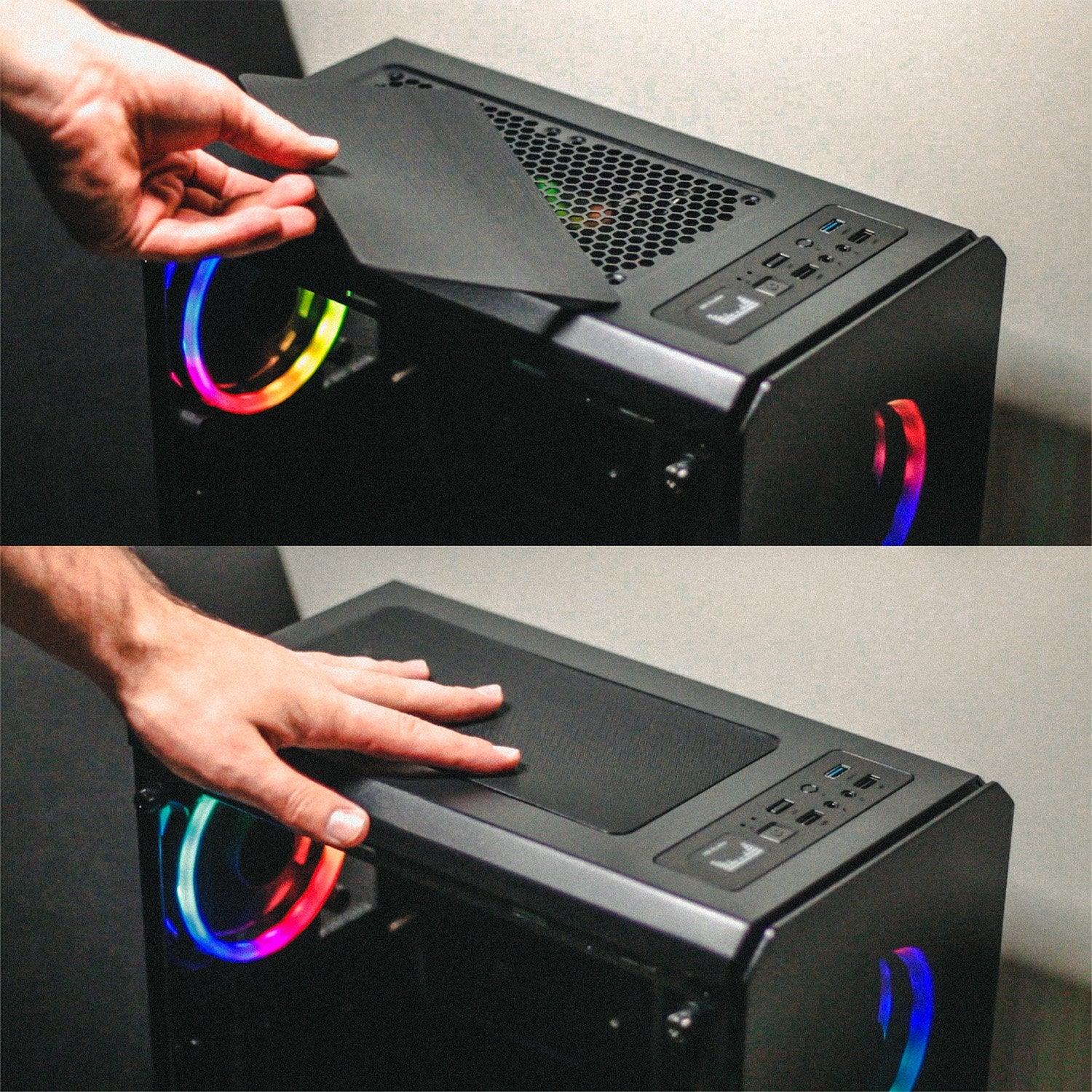To get you started right, weāve included 4 120mm fans that give you generous airflow to keep components cool. Each included fan has RGB color capability. There are two additional 120mm fan slots on the top of the case and PSU fan slot, each with removable dust collectors.