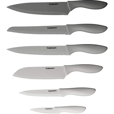 Cuisinart Advantage professional-quality stainless steel knives each have a cutting-edge and nonstick coating that makes slicing easier. These premium knives come with blade guards and feature ergonomic handles.