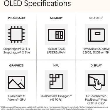 The new Surface Pro is the most flexible 2-in-1 laptop, now reimagined with more speed and battery life for all-new AI experiences, powered by Snapdragon X Elite and Plus processors with an industry leading NPU. All wrapped up in an ultra-portable design that can replace your tablet, your laptop, and power your multi-monitor set-up. The new Surface Pro Flex Keyboard allows you to position your Surface Pro and keyboard where they suit you, designed to be used both attached or detached.