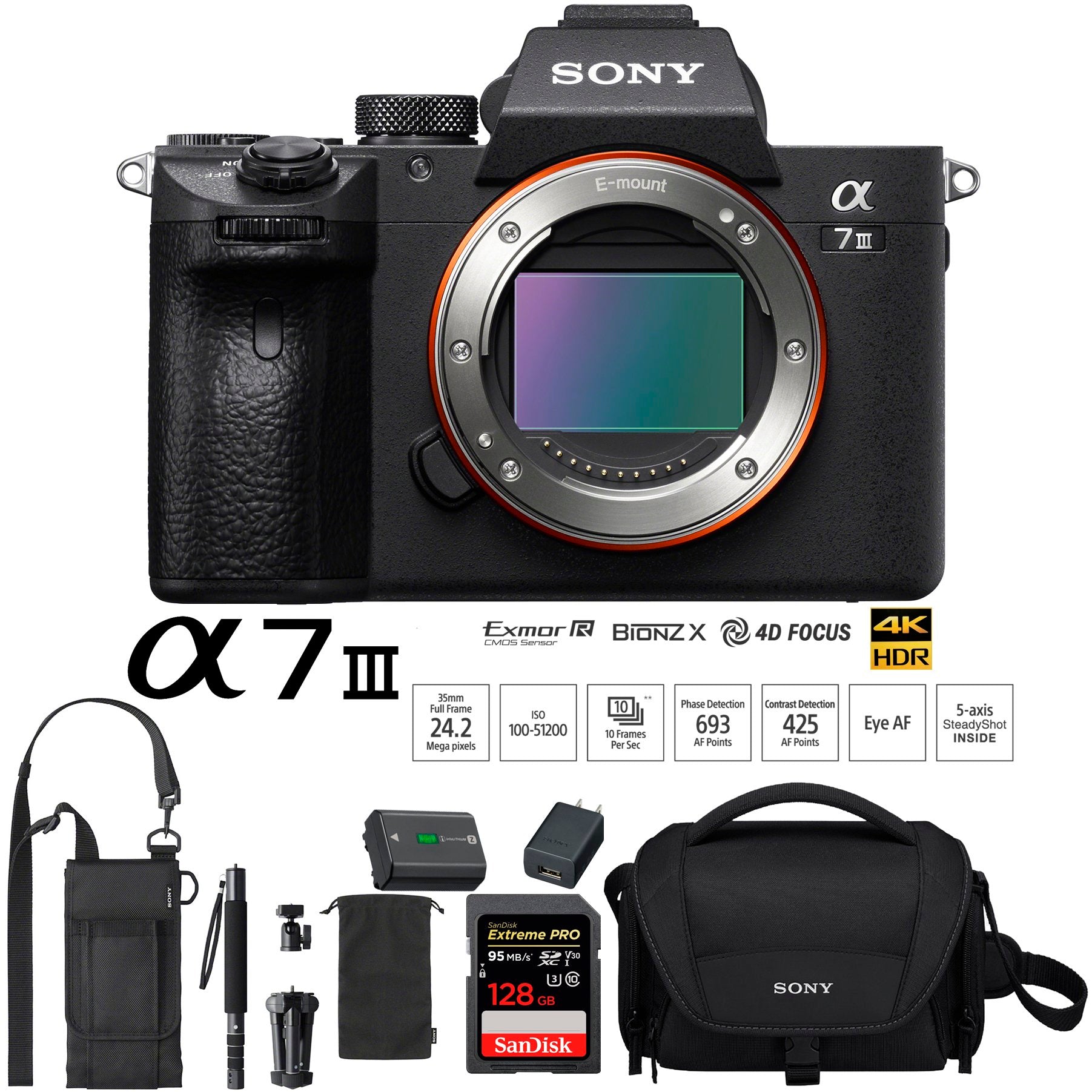 Sony a7III Full Frame Mirrorless ILC Camera and Monopod 128GB Memory Card Case Bundle