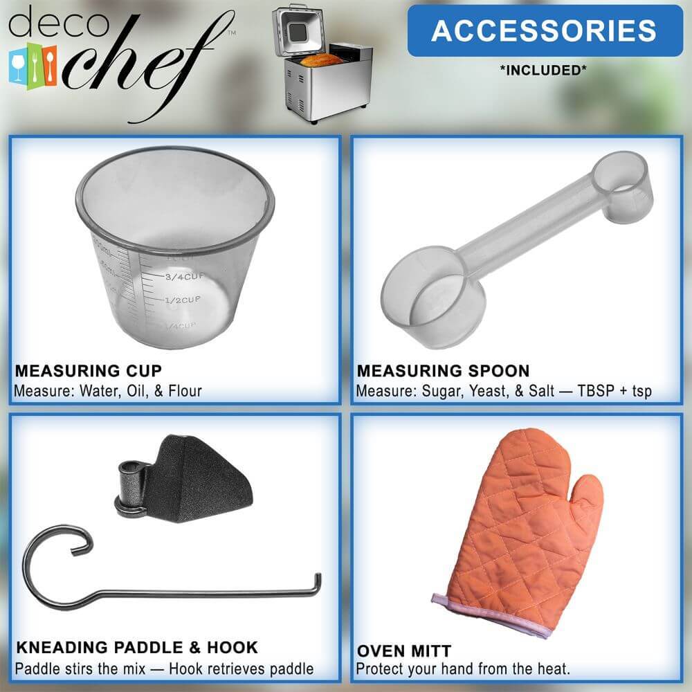 Each bread maker comes with a measuring cup, measuring spoon, kneading paddle, and hook. Additionally, instructions are included that help explain the function of the bread maker and the purpose of each program.