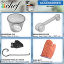 - Comes with measuring cup, measuring spoon, kneading paddle, and hook