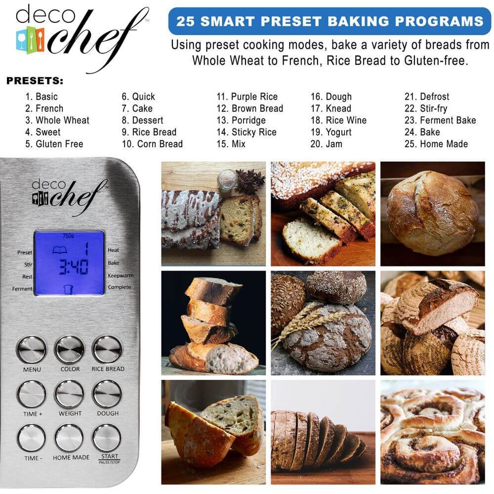 You don’t need to be an expert or an entire bakery to make delicious breads at home with the Deco Chef 2LB Stainless Steel Bread Maker with 25 Smart Cooking Programs. Through careful measurements and a few button presses, you’ll have not only breads, but cakes, yogurts, rice wines, and more!