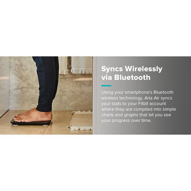 Meet your fitness goals with this black Fitbit Aria Air smart scale. The simple design lets you weigh yourself with one step, and the bright display shows your current weight in easy-to-read characters. Featuring integrated Bluetooth connectivity, this Fitbit Aria Air smart scale syncs with the Fitbit app and automatically tracks your progress towards your weight-loss goals.Ā