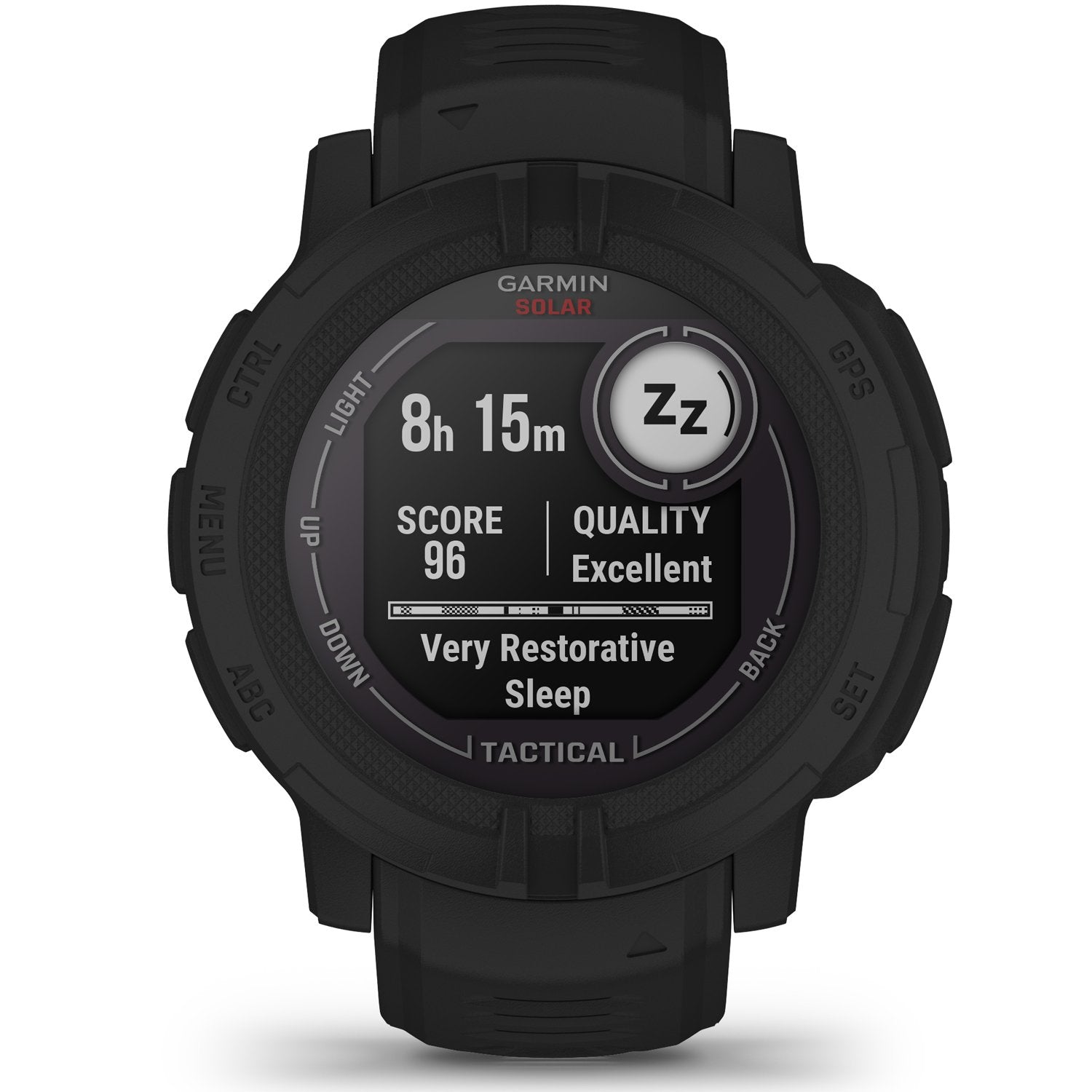 Why just carry out the mission? Own it with Instinct® 2 Solar – Tactical Edition. This rugged GPS smartwatch is built to U.S. military standard (MIL-STD-810), is water-rated to 100 meters and features solar charging, which gives you unlimited battery life in smartwatch mode (assuming all-day wear with 3 hours per day outside in 50,000 lux conditions). Dedicated tactical features, such as night vision goggle compatibility, waypoint projection and dual-position GPS format, keep you mission ready. Stealth mode lets you go dark by disabling wireless communication and data sharing. Multiple global navigation satellite systems (GPS, GLONASS and Galileo) help you track in more challenging environments than with GPS alone. All-day health monitoring lets you keep track of your general wellness — helping you to stay ready for anything (this device is intended to give an estimation of your activity and metrics; it is not a medical device).