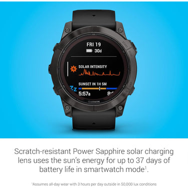 Get up to 37 days in smartwatch mode with solar charging in 3 hours of direct sunlight (50,000 lux) per day and up to 122 hours in GPS mode with solar charging (assumes continuous use for entire period in 50,000 lux conditions).
