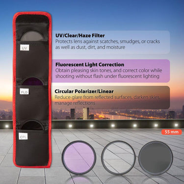 Deco Photo 55mm 3 Piece Pro Level Lens Filter Kit - UV, FLD, Polarizer - FK55MM