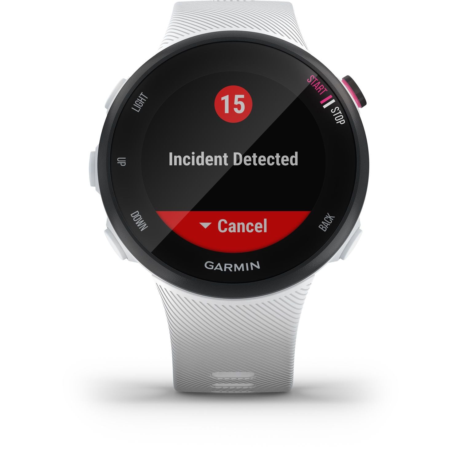 Safety and tracking features make it easy to share your location with chosen contacts in case you need assistance â manually, or automatically with built-in incident detectionÂł. And a variety of connected features keeps you in touch with the rest of the world during and in between runs. Get smart notifications delivered to your wrist for incoming text messages and phone calls. And when paired with your compatible smartphone, Forerunner 45 will automatically upload your run data to the Garmin Connect online fitness community. It even has handy controls for the music playing on your phone, so you can skip songs without missing a beat.