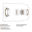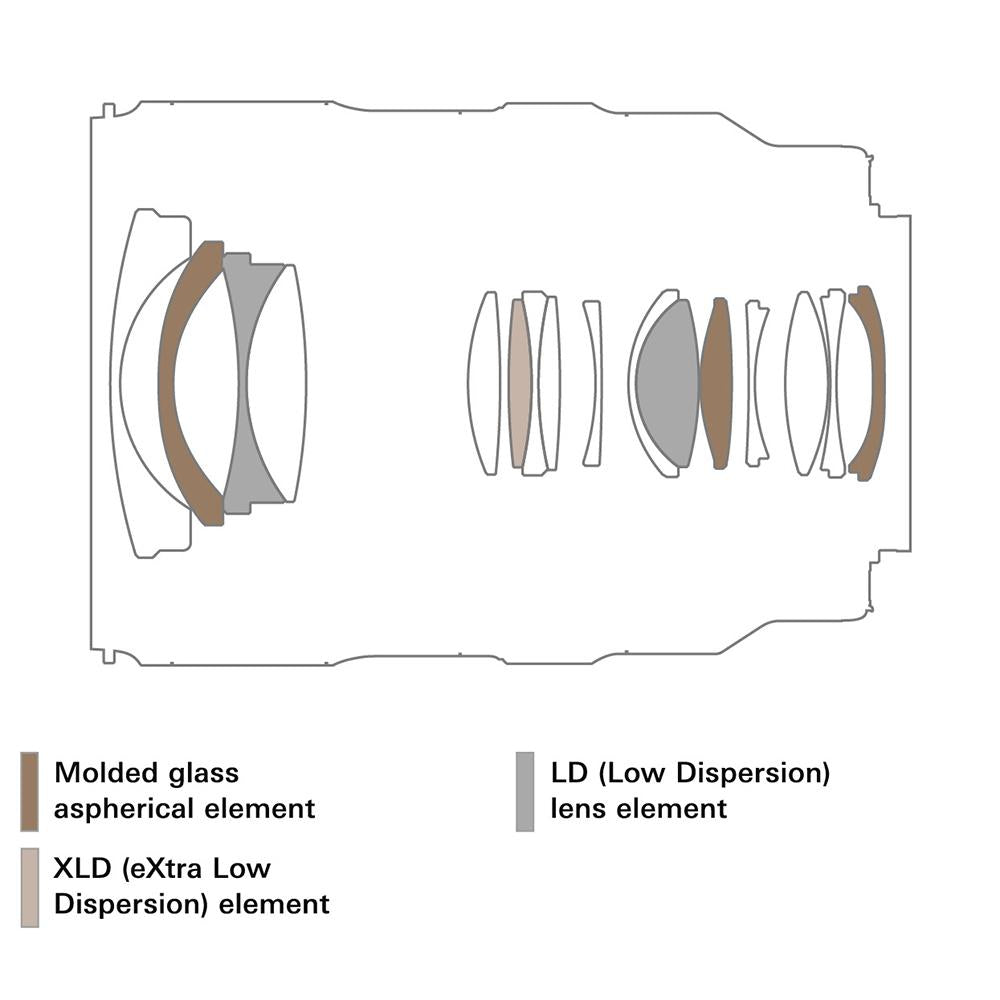 Includes: 1 XLD (eXtra Low Dispersion), 2 LD (Low Dispersion), and 3 GM (Glass Molded Aspherical) lenses