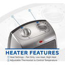 This ceramic heater features easy-to-use manual controls; 2 heat settings plus a fan-only mode and an adjustable thermostat that allows you to maintain your preferred temperature setting.