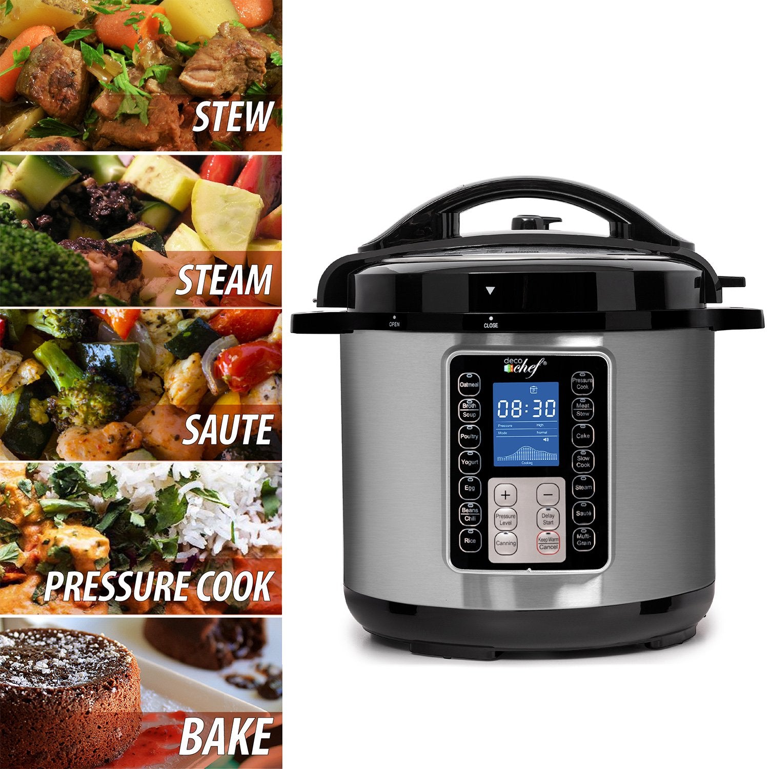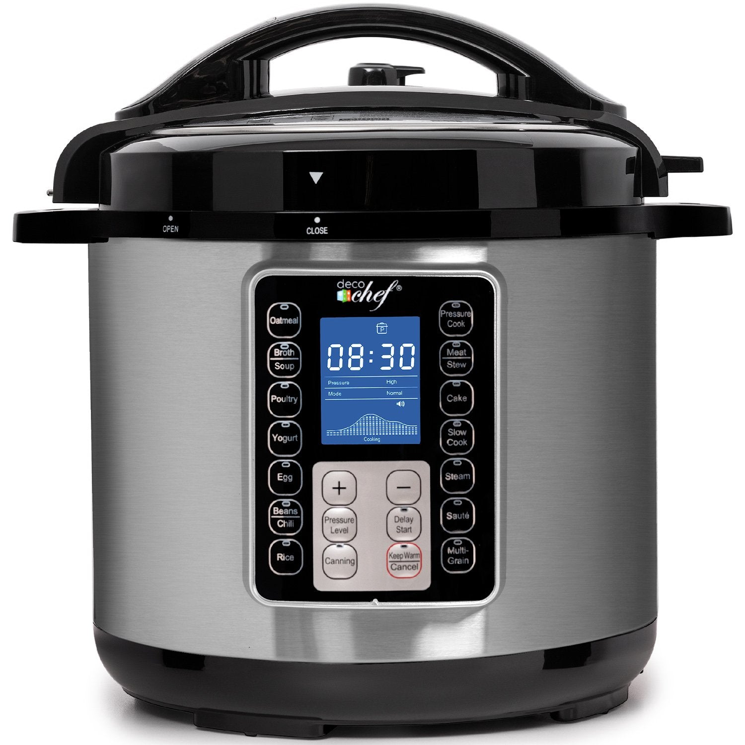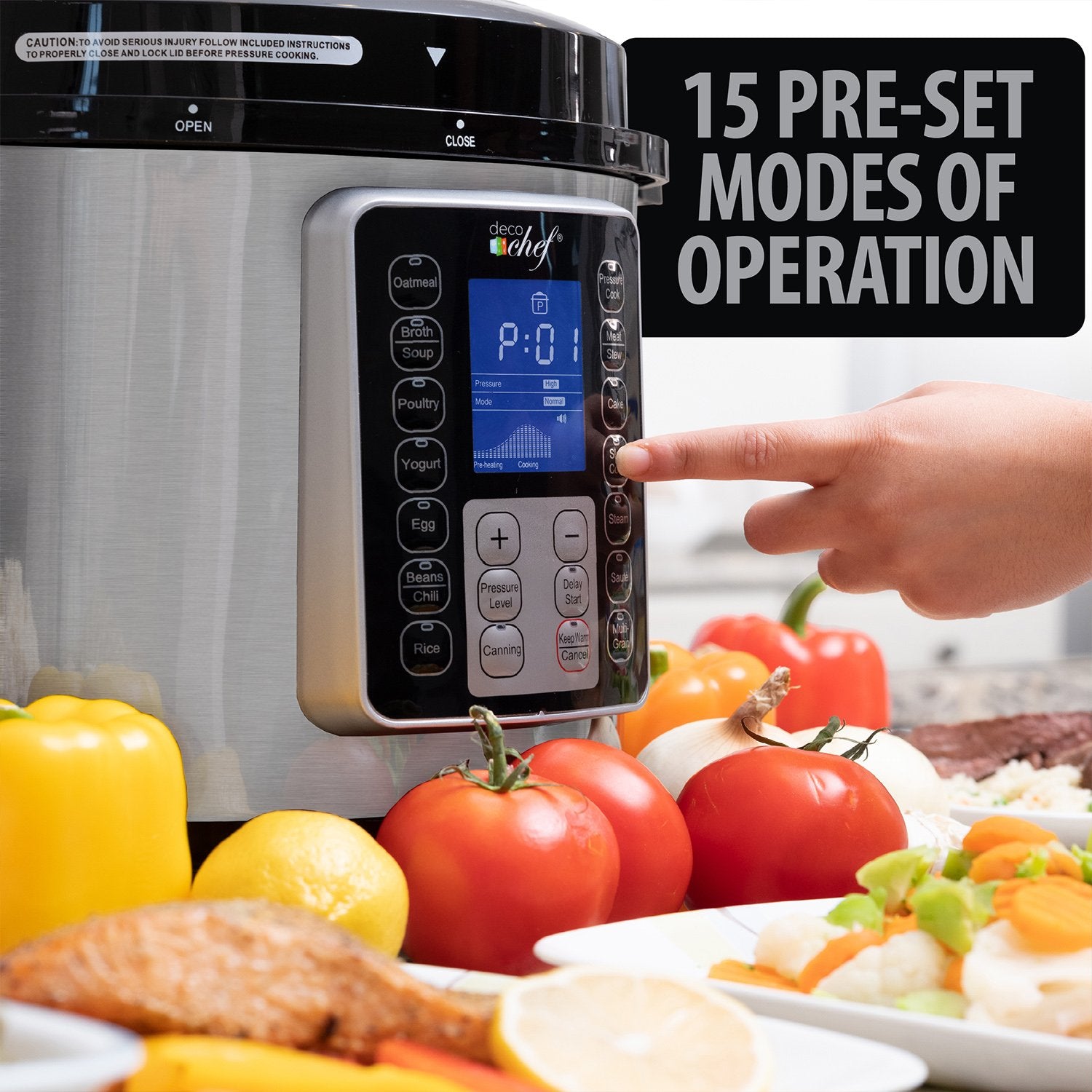 Using the finest materials and construction processes, the Deco Chef pressure cooker brings real and lasting value to your kitchen and dinner table. Built to last and deliver delicious foods, this stainless steel appliance utilizes high-quality rubber seals, heat-resistant handles, and resilient internal electronics.