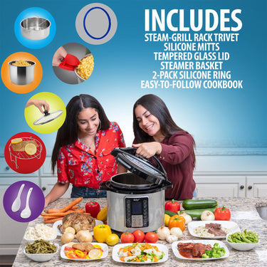 Included are a variety of helpful accessories – you get a Deco Chef Recipe Book, 2-Pack Silicone Sealing Ring Set, Silicone Mini Mitts, Stainless Steel Steamer/Grill Rack, Tempered Glass Pressure Cooker Lid, Steamer Basket. Everything you need to make healthier, faster meals and take back dinner time.