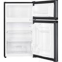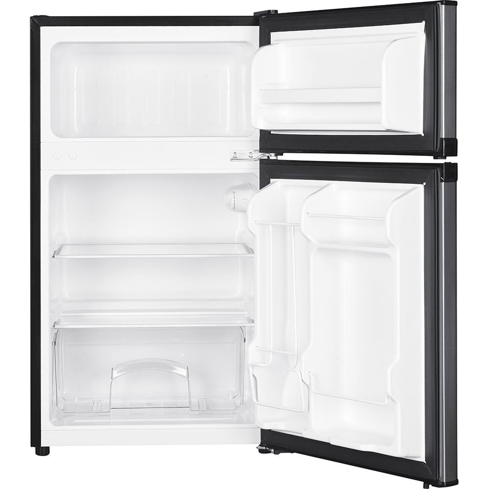 Utilize your space with this sleek 3.1 cubic foot compact refrigerator that provides ample storage for food and beverages. The adjustable thermostat makes it easy to regulate the temperature to preserve full flavor and freshness. The interior accommodates a wide variety of perishables, with clear-view vegetable and fruit crisper, removable and adjustable shelves, and built-in door storage, including a can holder, for items you want to grab quickly. A large separate freezer compartment with its own door stores ice cream, frozen vegetables, meats and more. Freezer and refrigerator doors are reversible for easy left or right-side opening access.